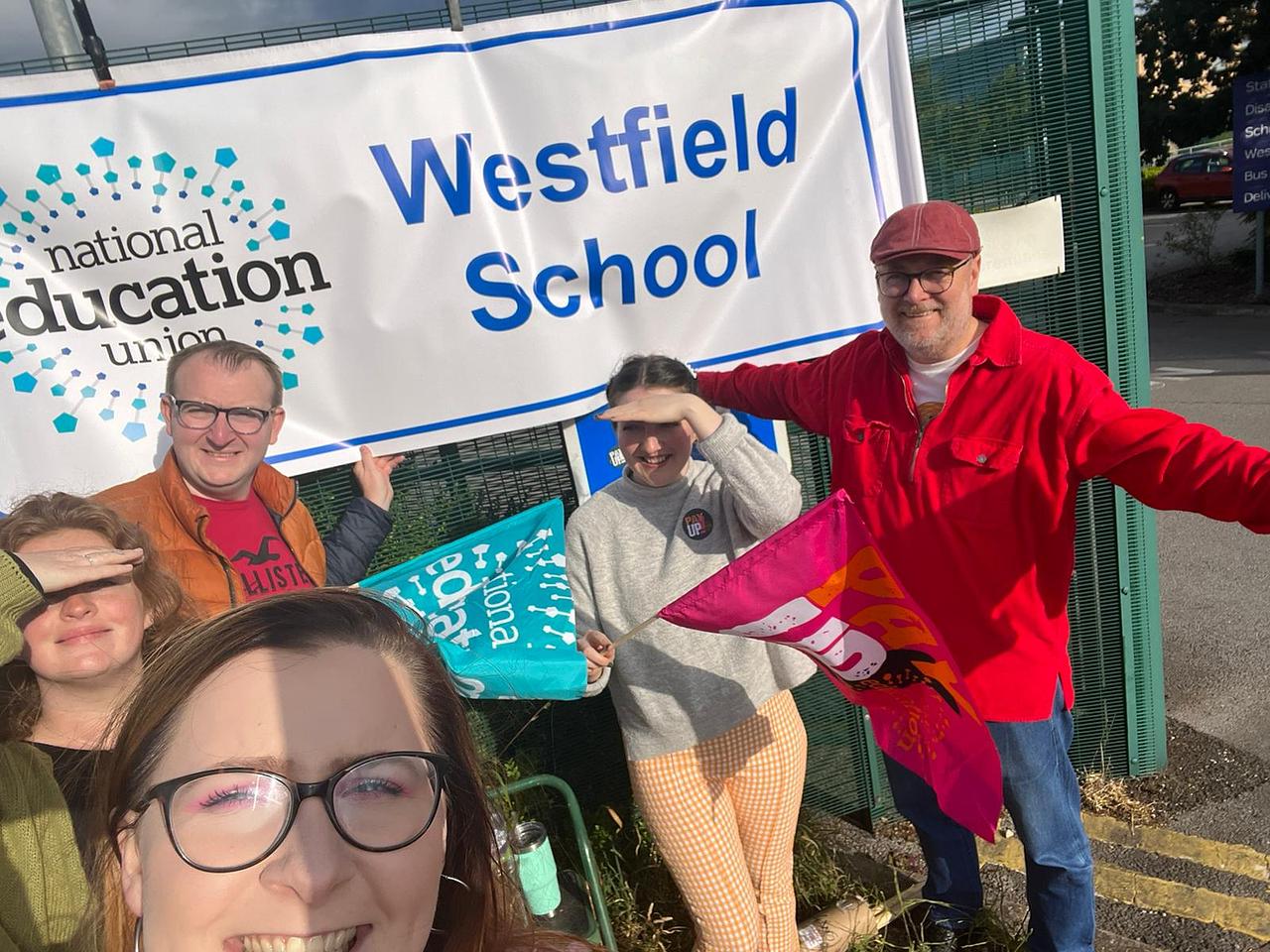 The sun is out on the picket at Westfield School Sheffield